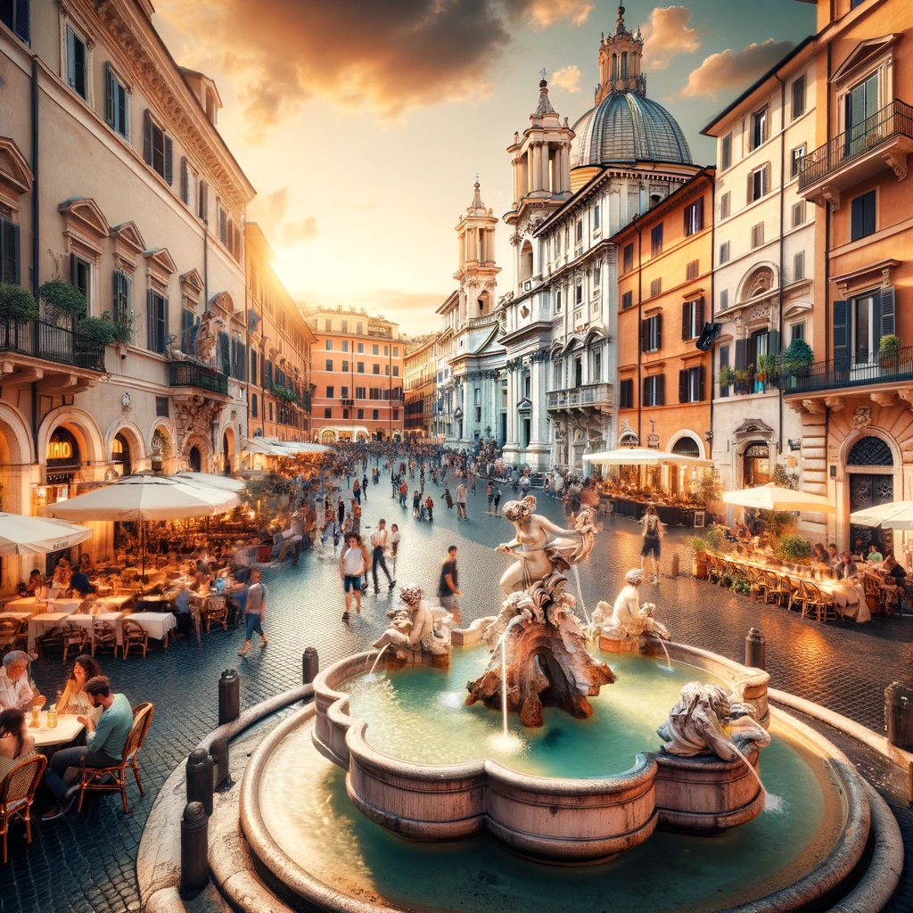 C’est une place animée avec de nombreux restaurants et cafés. Les principales caractéristiques de la place sont ses fontaines et la copie d’un obélisque égyptien. À la base de l’obélisque, se trouve la célèbre fontaine La Fontana Dei Quattro Fiumi.